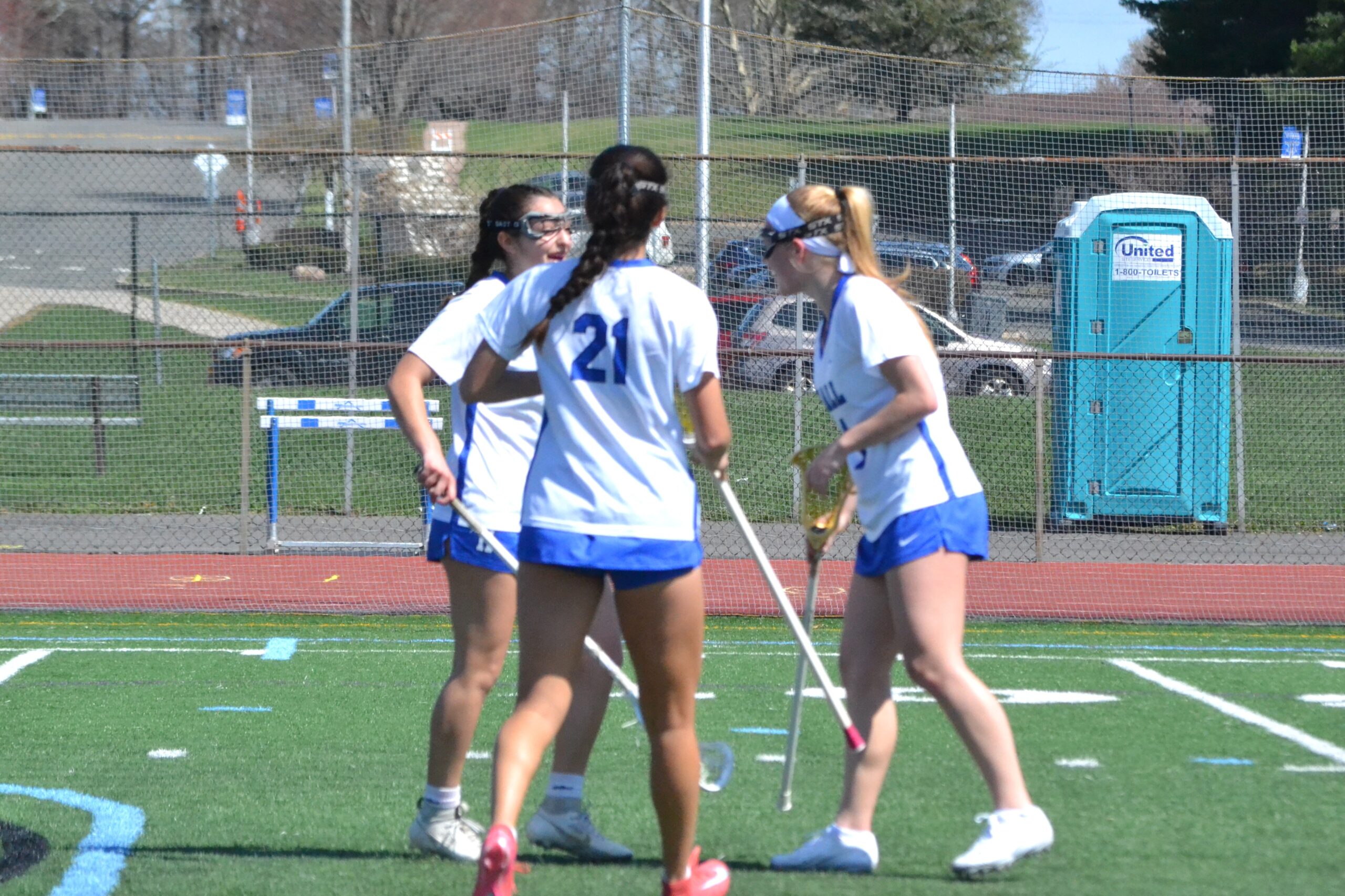 Lucy Gwiazdoski (l) celebrates one of her 5 goals with teammates Aliza Schleif (21) and Anya Leshem (r)