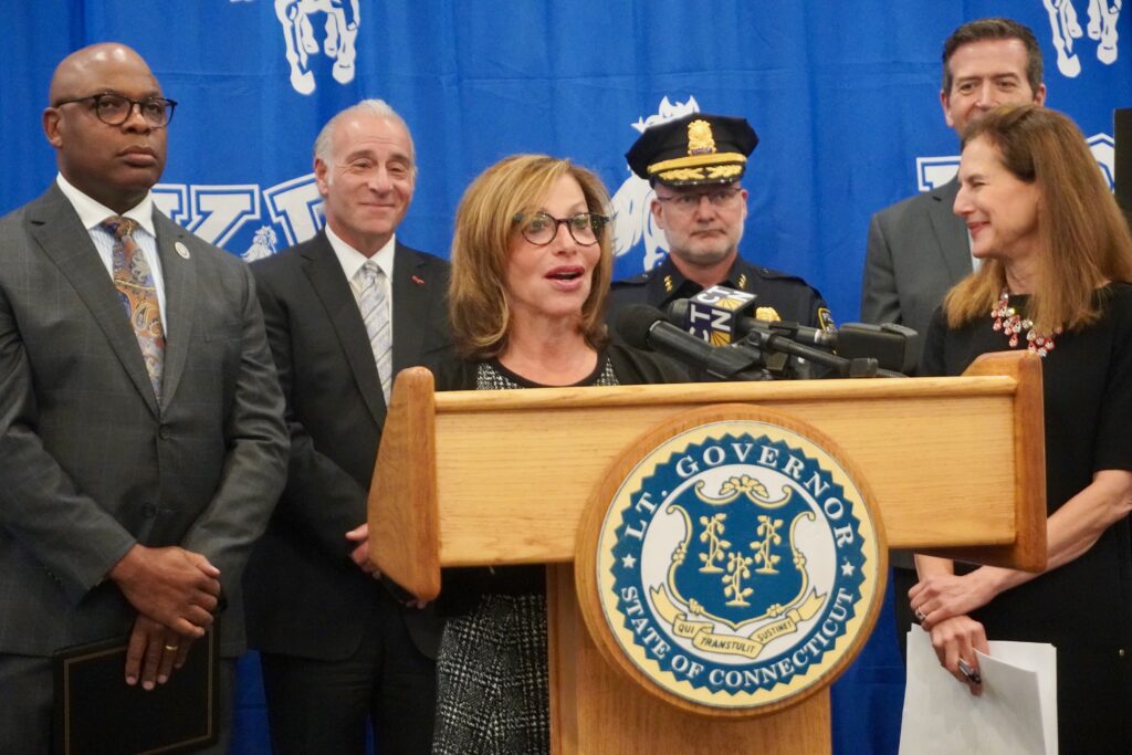 Lt. Gov. Susan Bysiewicz speaks at a press conference on Halloween safety at King Philip Middle School in West Hartford. Oct. 30, 2025. Photo credit: Ronni Newton