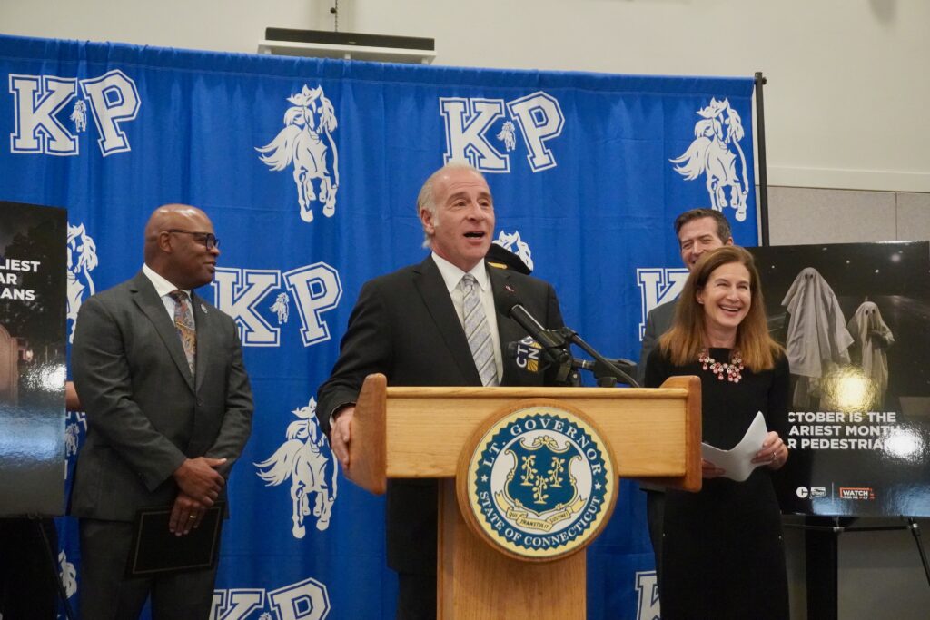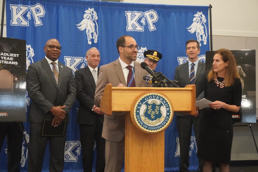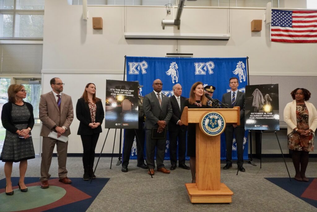 “With the Halloween holiday coming up there are a lot of families and young people walking all throughout our community and we want to make sure that they are safe,” said West Hartford Mayor Shari Cantor, welcoming the other officials to town and noting that right outside King Philip Middle School is one of the town’s new raised crosswalks, installed this summer as part of the Vision Zero initiative.