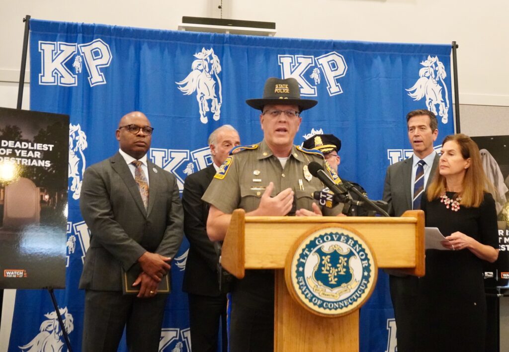 A representative of the Connecticut State Police speaks at a press conference on Halloween safety at King Philip Middle School in West Hartford. Oct. 30, 2025. Photo credit: Ronni Newton