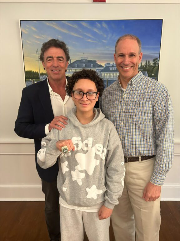 From left: Boston Celtics co-owner and CEO Wyc Grousbeck, Little Brother Ocean trying on the Celtics Championship ring, Big Brother Joe DeLutrie of West Hartford. Courtesy photo