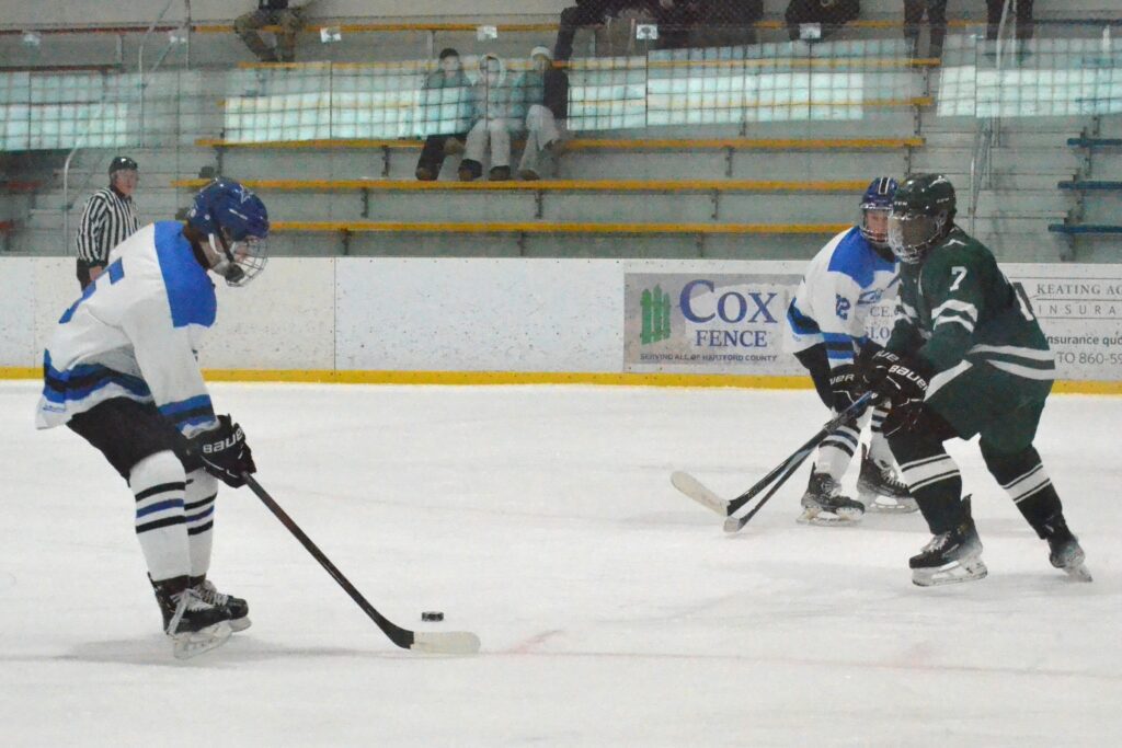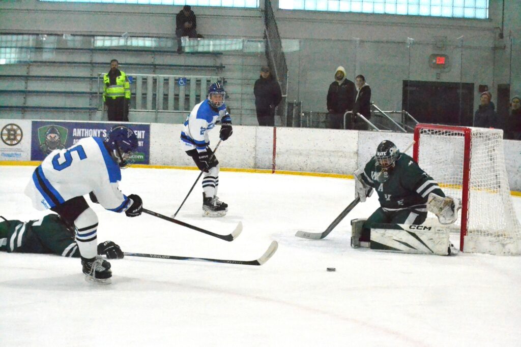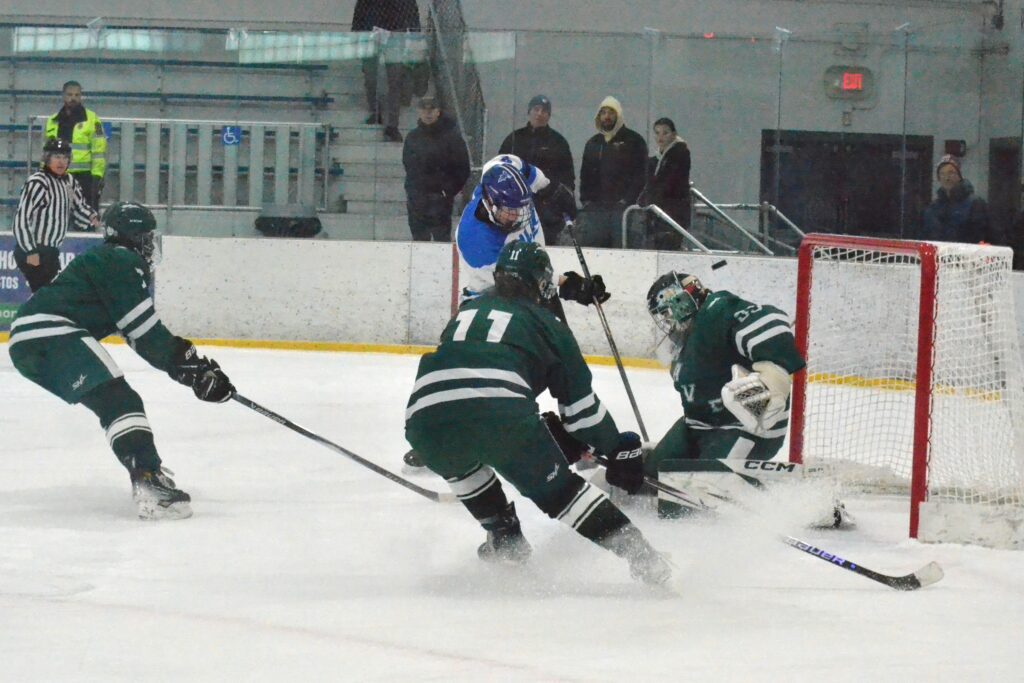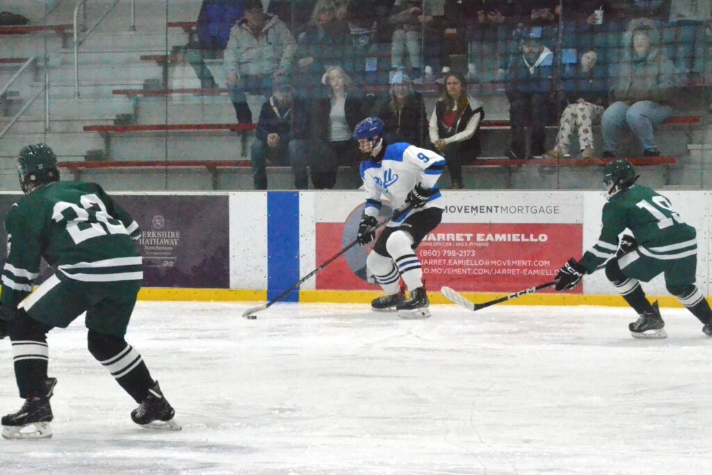 New Milford needed to start generating more offense having been outshot 25-7 in the second and 44-14 through two periods, but it was Hall getting shot after shot on Boisvert from all angles and distances. The senior goalie stood strong in the early part of the final period making several good saves to try and keep his team in the game. It nearly paid off when Jonathan DeRoberts picked up a loose puck and let a wrister go from the left of Bonner that the goalie knocked down and his defense cleared away five minutes in.