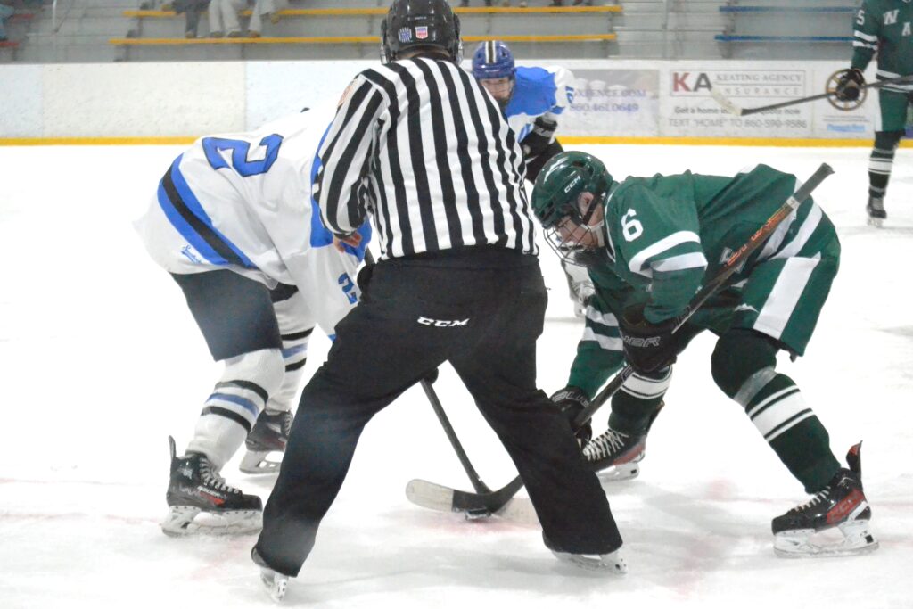 Charlie Ganey takes the draw against Carson Rainey. Hall vs. New Milford boys hockey. Jan. 31, 2026. Photo credit: Paul Palmer