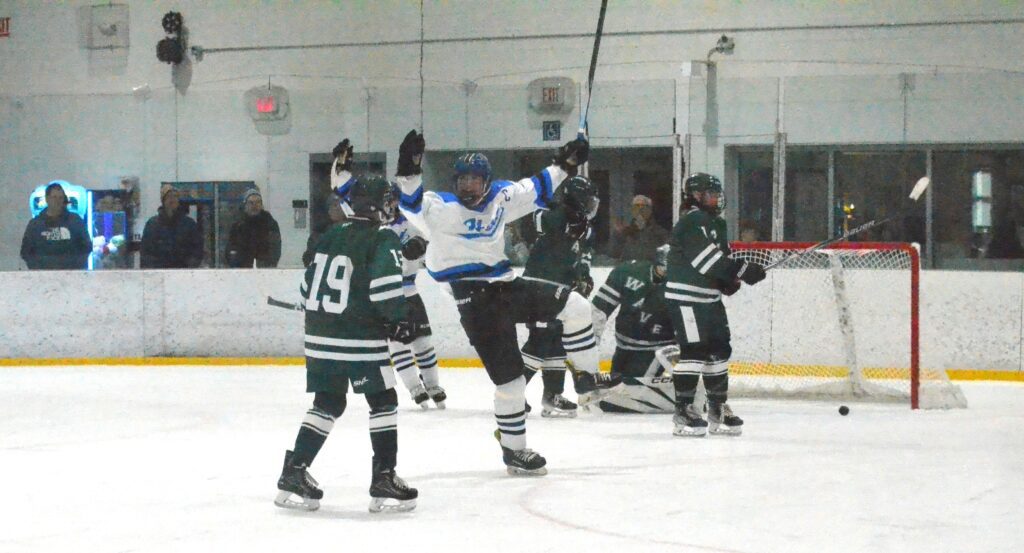 Dillon McDermott celebrates his third period goal. Hall vs. New Milford boys hockey. Jan. 31, 2026. Photo credit: Paul Palmer