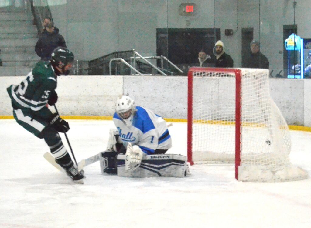 Hall nearly gifted New Milford the tying goal minutes later when they gave up a 3-on-none breakaway. With four Hall players down deep, a Hall defender failed to hold the puck in at the blue line. Cam Gagnon carried the puck in for the Green Wave and snapped a rising wrister that goalie Matthew Bonner blockered away over the back glass.
