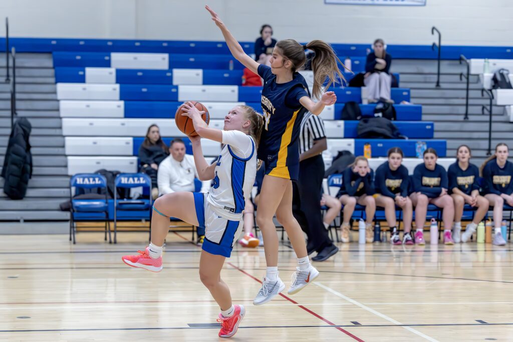 Chloe Lynch is attempting a layup. Hall vs. Simsbury girls basketball. Jan.23, 2026. Photo credit: Scott Sulkazi