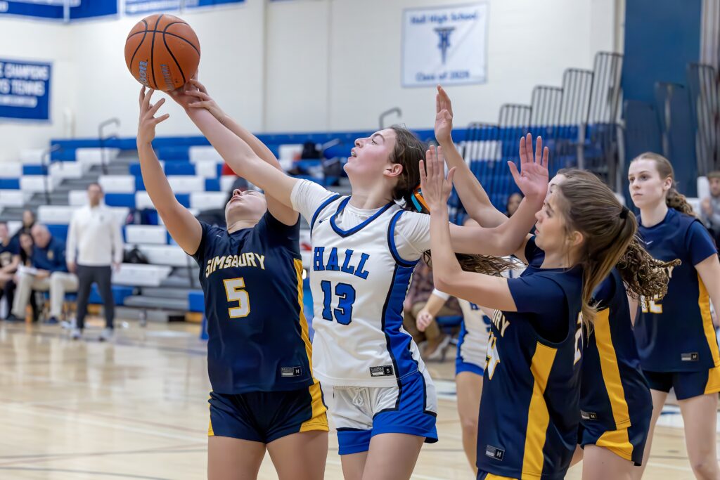 Titans and Trojan players fight for possession. Hall vs. Simsbury girls basketball. Jan.23, 2026. Photo credit: Scott Sulkazi