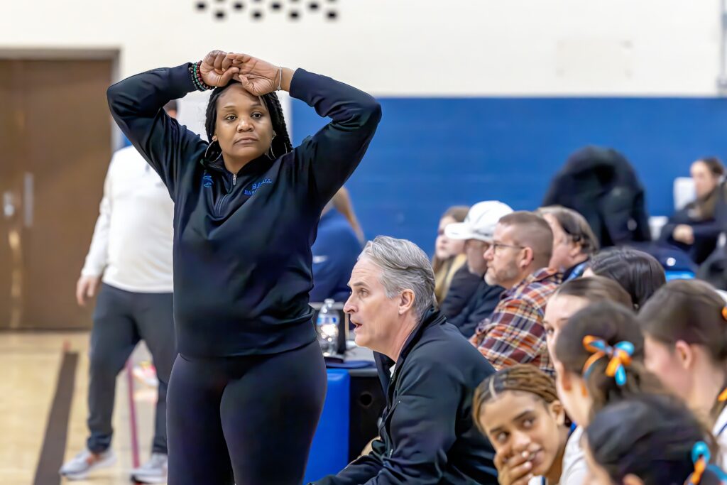 Hall head Coach Ernestine Faienza is frustrated. Hall vs. Simsbury girls basketball. Jan.23, 2026. Photo credit: Scott Sulkazi