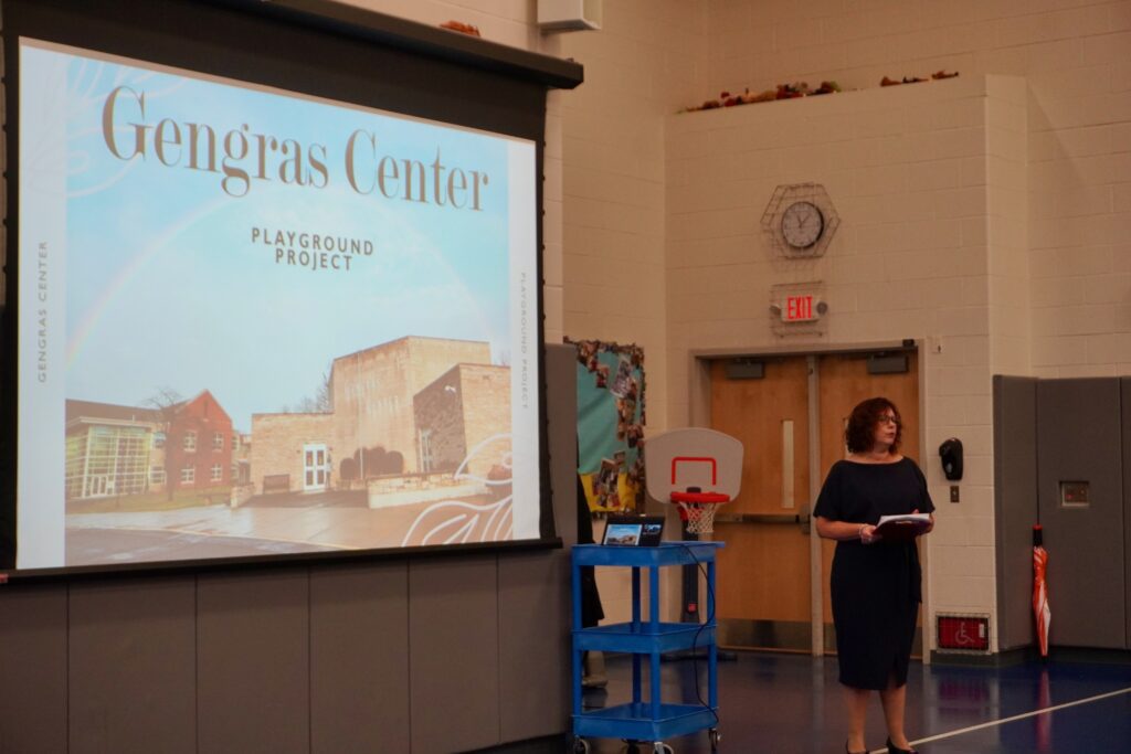 Michelle Lestrud, director of the Gengras Center at the University of Saint Joseph in West Hartford, shares the details of the new playground. Photo credit: Ronni Newton