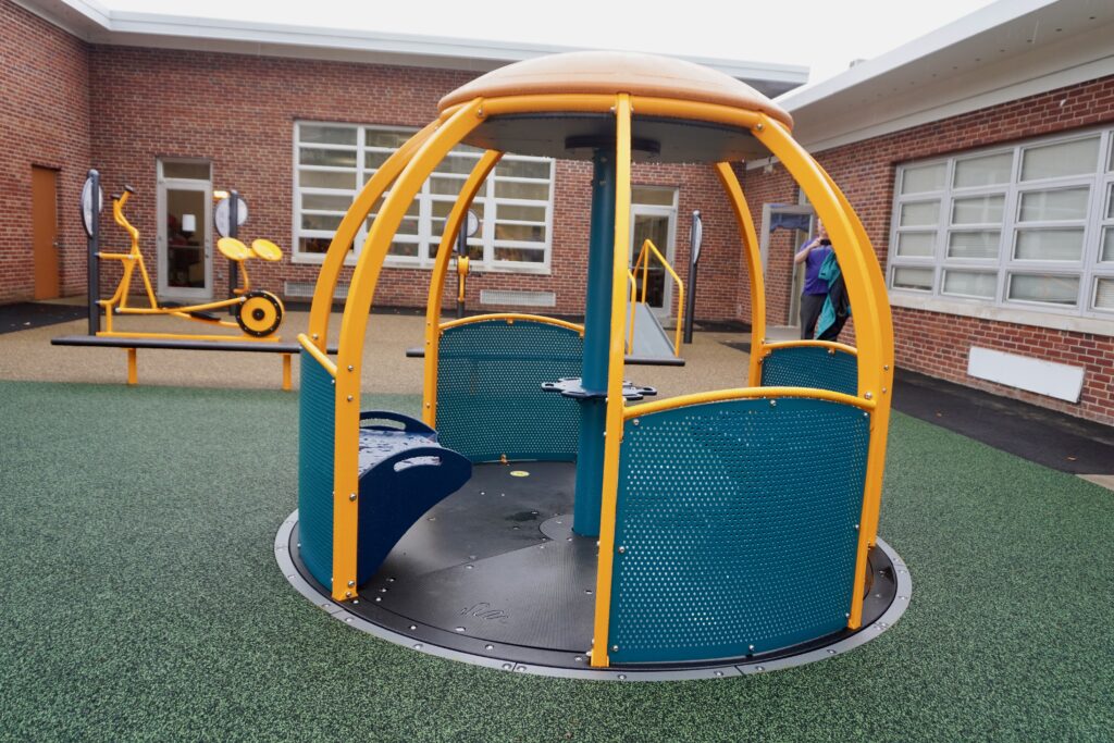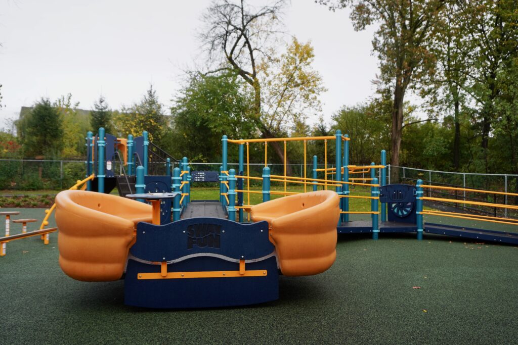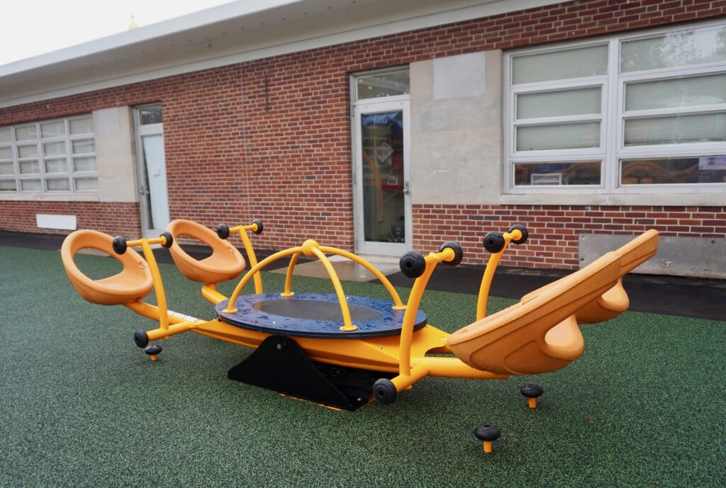 The new playground is “bright, accessible, and fun,” said Lestrud – a place where students can run around freely, swing, and also enjoy the many spinning elements. The playground is a space that encourages “playing together, that helps develop motor skills, and where we’re working on building strength and building that sense of community among our students.”