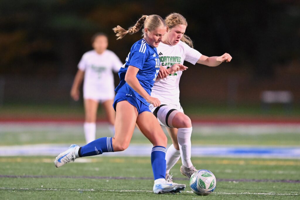 Madeline Rudy and Alexa Reily are fighting for possession. Hall vs. Northwest Catholic girls soccer. Oct. 15, 2025. Photo credit: Craig Rosenberg