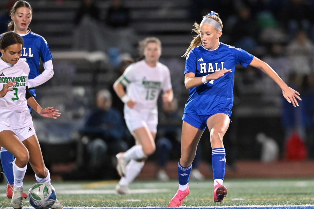 Olivia Roberts is trying to find an opening. Hall vs. Northwest Catholic girls soccer. Oct. 15, 2025. Photo credit: Craig Rosenberg