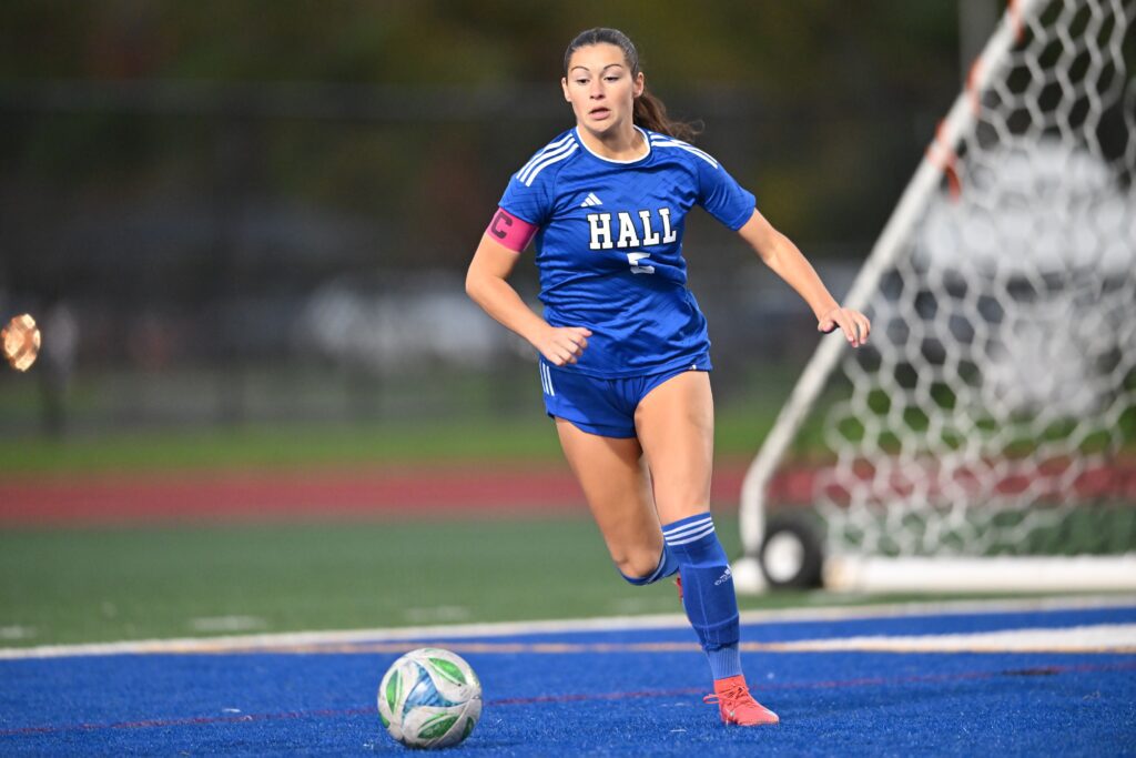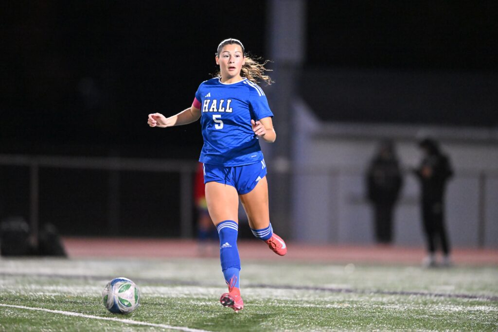 Captain Sienna Calabro possessing the ball . Hall vs. Northwest Catholic girls soccer. Oct. 15, 2025. Photo credit: Craig Rosenberg