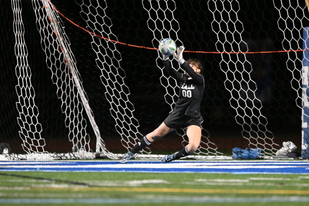 Sadie Leibin saves a goal attempt from Northwest Catholic. Hall vs. Northwest Catholic girls soccer. Oct. 15, 2025. Photo credit: Craig Rosenberg