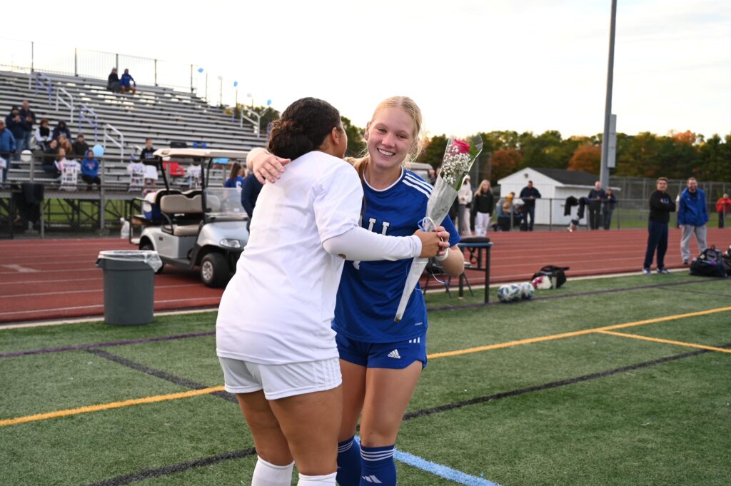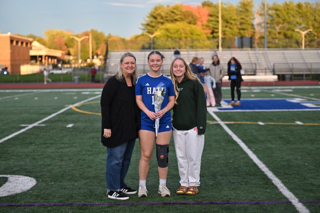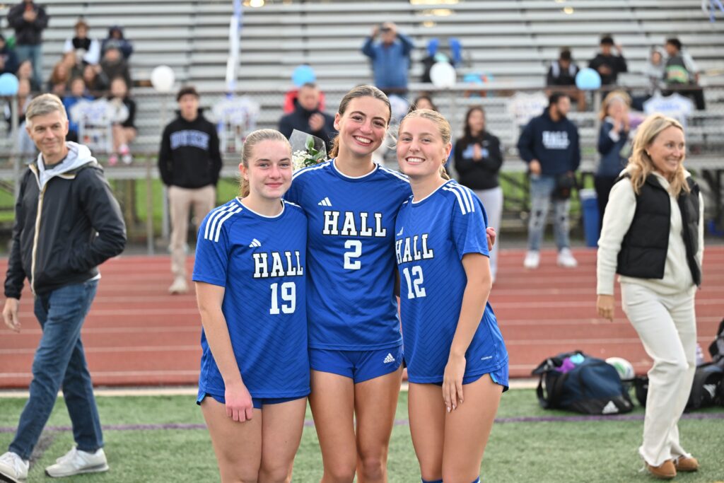 Lilah Stagg, Alexa Reily, and Vienna Knox together on senior night. Hall vs. Northwest Catholic girls soccer. Oct. 15, 2025. Photo credit: Craig Rosenberg