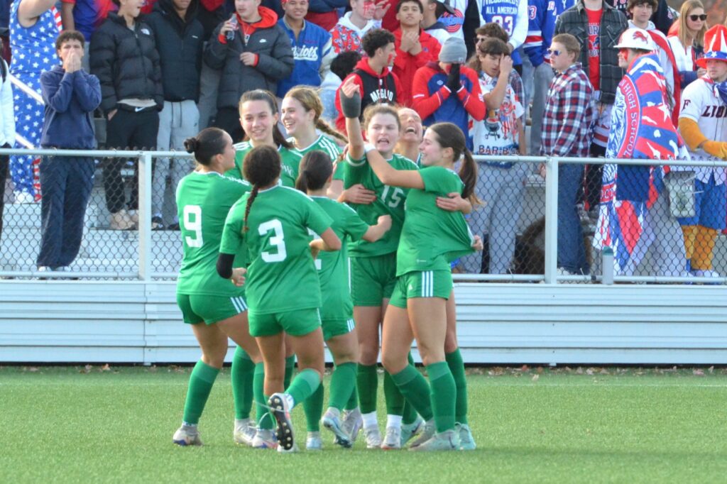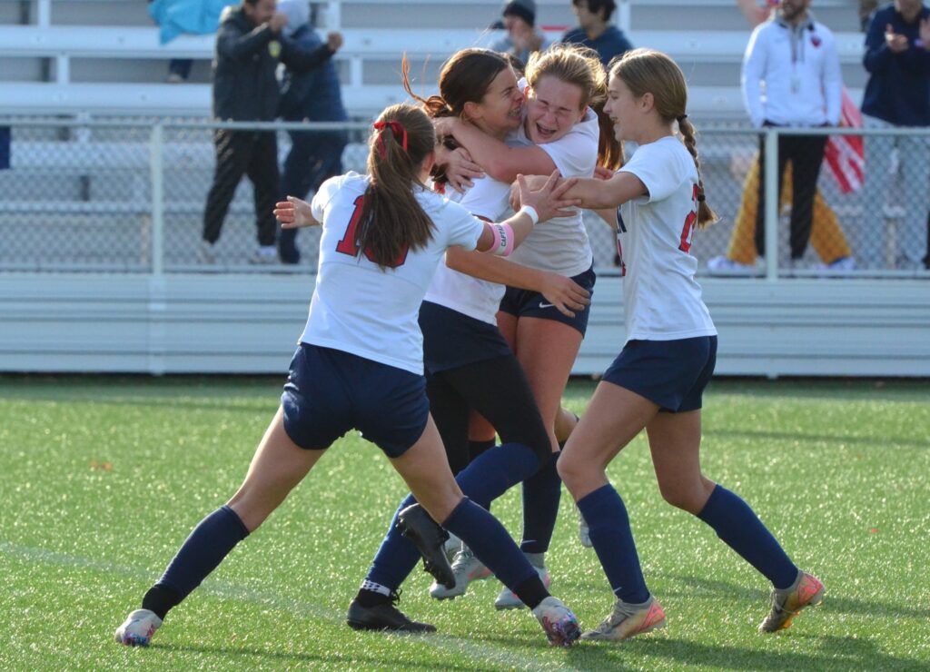 Foran players celebrate Maria Azpiri-Sudusky’s game winning goal agains Nothwest Catholic. Northwest Catholic vs. Foran CIAC Class M girls soccer championship. Nov. 15, 2025. Photo credit: Paul Palmer