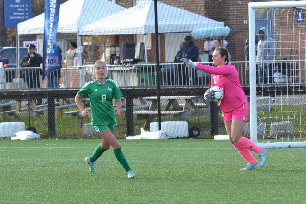 Three minutes later the pressure by Northwest would pay off with a tying goal after Frederick misplayed a ball in front of her goal. Northwest’s first try was blocked away be a defender, but the ball fell to Staunton who laid off a perfect square pass to an onrushing senior co-captain Ashlyn Sklenka who drove the ball high, off the underside of the crossbar, deflecting straight down over the goal line to tie it up once again.