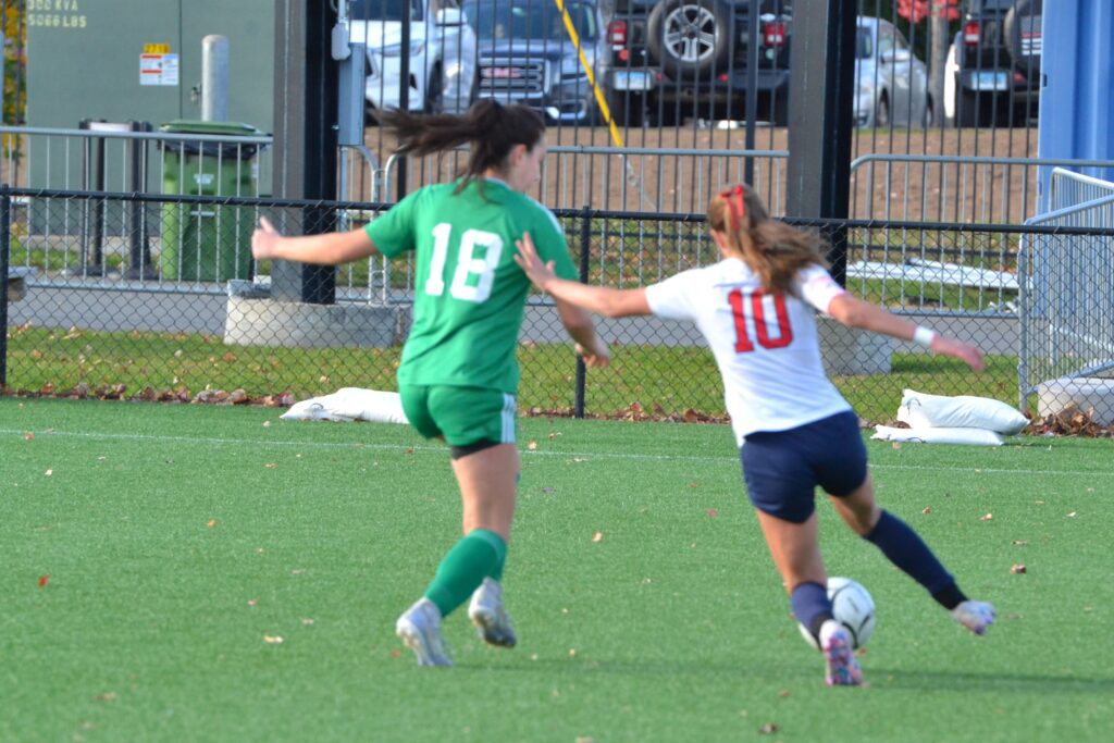 Maeve Staunton gets off the shot ahead of Madeline Salil of Foran. Northwest Catholic vs. Foran CIAC Class M girls soccer championship. Nov. 15, 2025. Photo credit: Paul Palmer