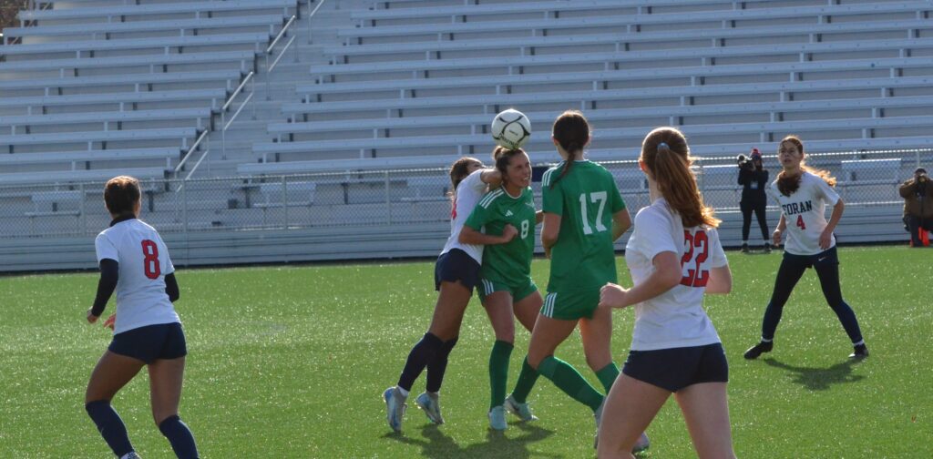 Madeline Rudy (8) gets the ball in the front of her head, and the forearm in the back. Northwest Catholic vs. Foran CIAC Class M girls soccer championship. Nov. 15, 2025. Photo credit: Paul Palmer