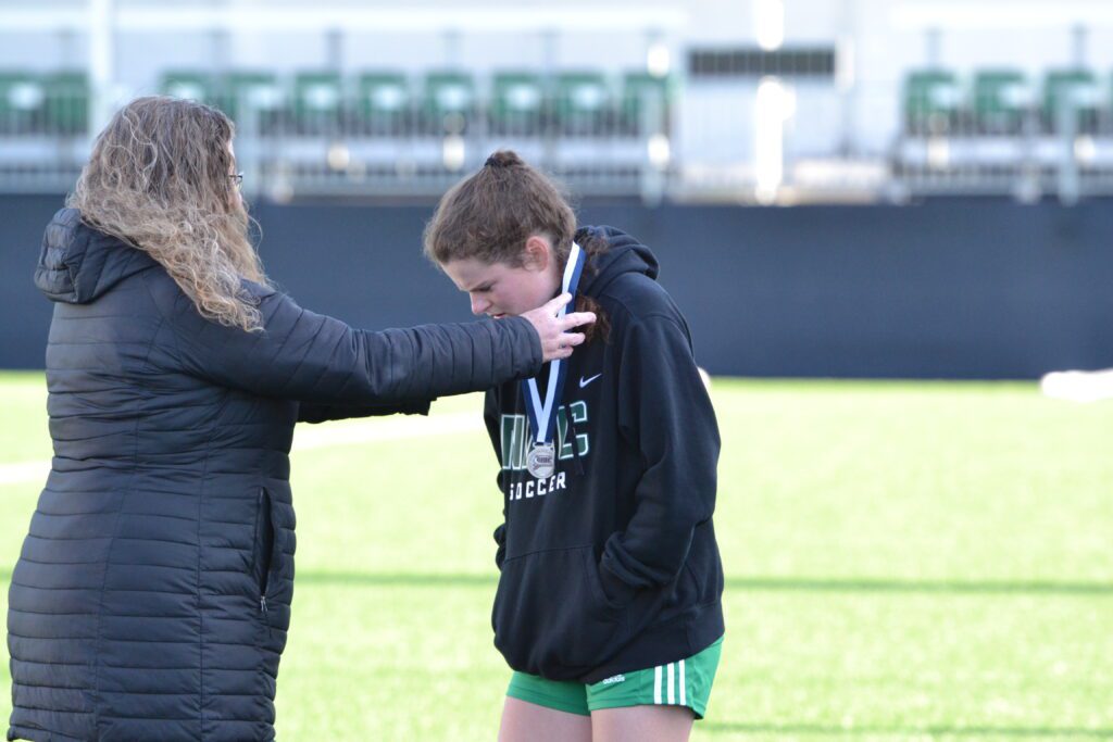 Maeve Staunton gets her runnerup medal after the game. Northwest Catholic vs. Foran CIAC Class M girls soccer championship. Nov. 15, 2025. Photo credit: Paul Palmer