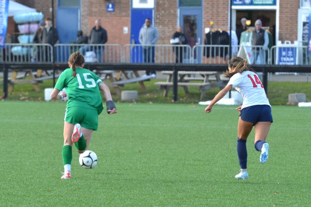 Emma Ahlstrand (13) tried to block the cross from Alexis Lafferty. Northwest Catholic vs. Foran CIAC Class M girls soccer championship. Nov. 15, 2025. Photo credit: Paul Palmer