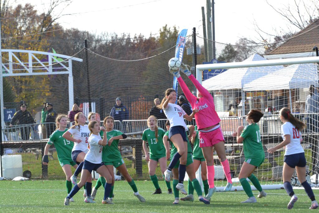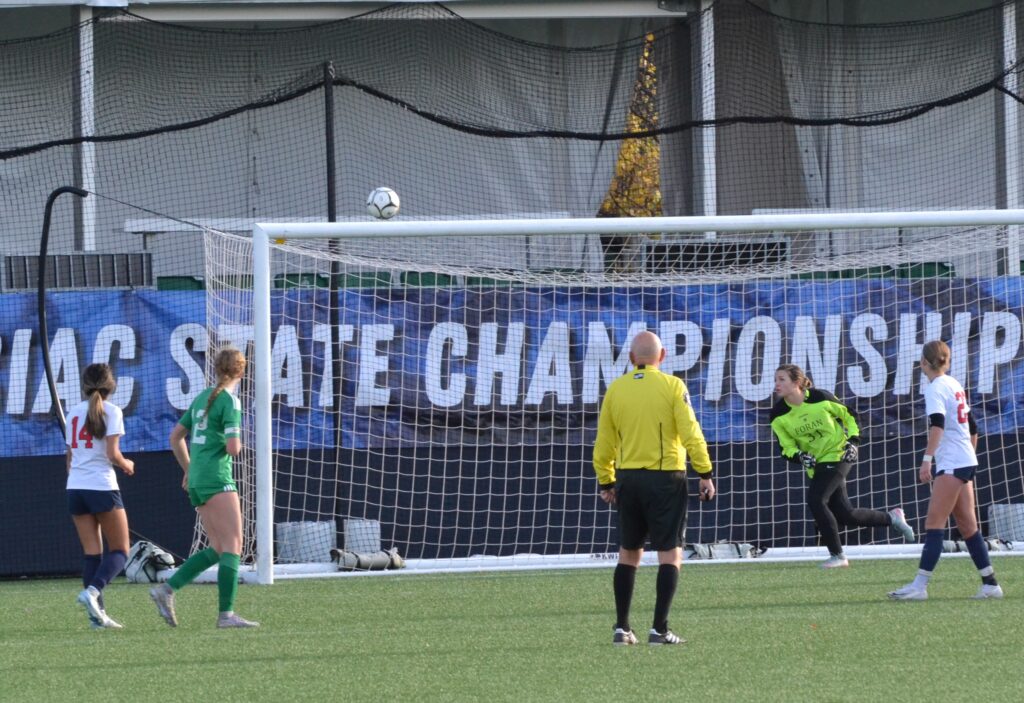 Northwest Catholic goalie Abby Casper deflects away the corner kick from Foran. Northwest Catholic vs. Foran CIAC Class M girls soccer championship. Nov. 15, 2025. Photo credit: Paul Palmer