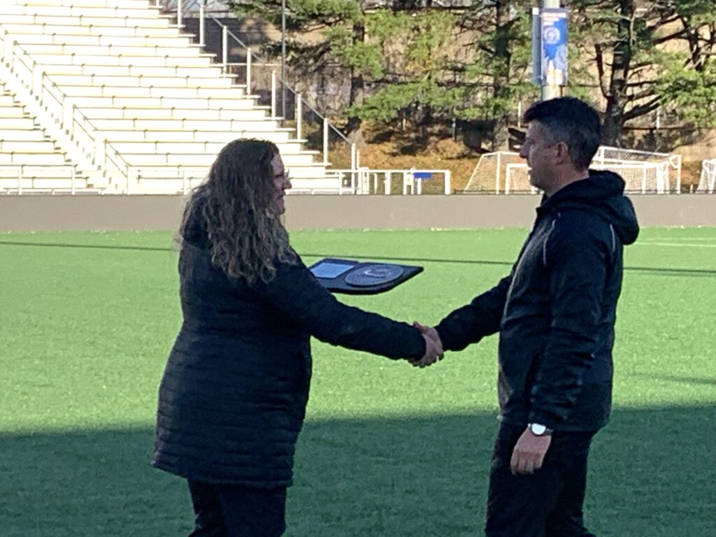 Northwest Catholic coach Steve Carnes accepts the runner-up plaque after the game. Northwest Catholic vs. Foran CIAC Class M girls soccer championship. Nov. 15, 2025. Photo credit: Paul Palmer