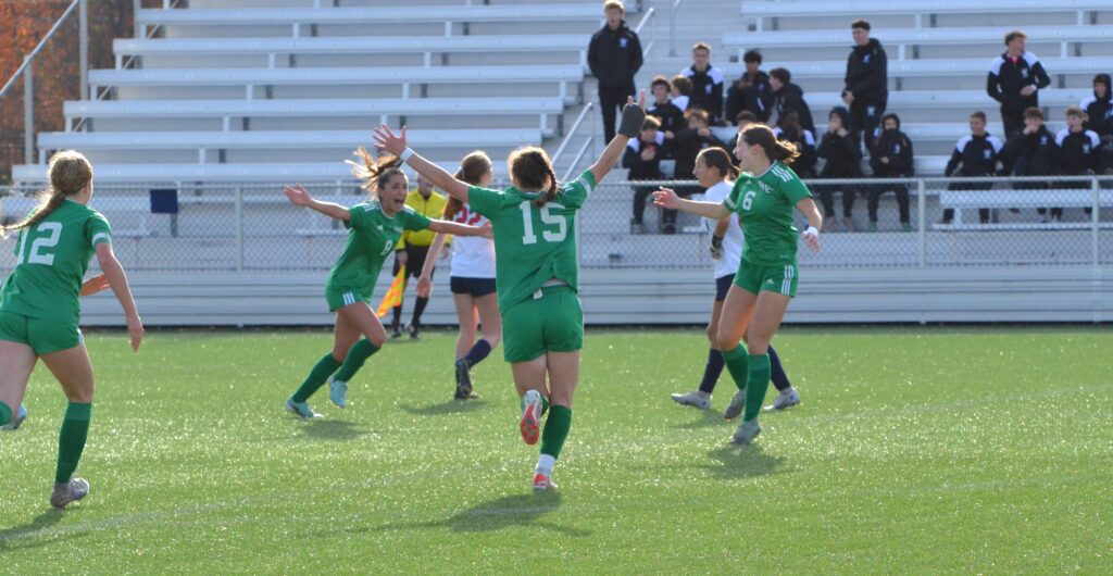 Northwest Catholic players celebrate their goal that tied the game at 2. Northwest Catholic vs. Foran CIAC Class M girls soccer championship. Nov. 15, 2025. Photo credit: Paul Palmer