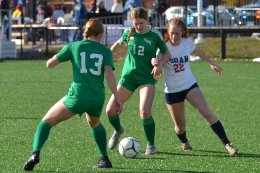 Northwest Catholic’s Allie Loveless (12) and Emma Ahlstrand (13) work against Allie Lafferty of Foran. Northwest Catholic vs. Foran CIAC Class M girls soccer championship. Nov. 15, 2025. Photo credit: Paul Palmer
