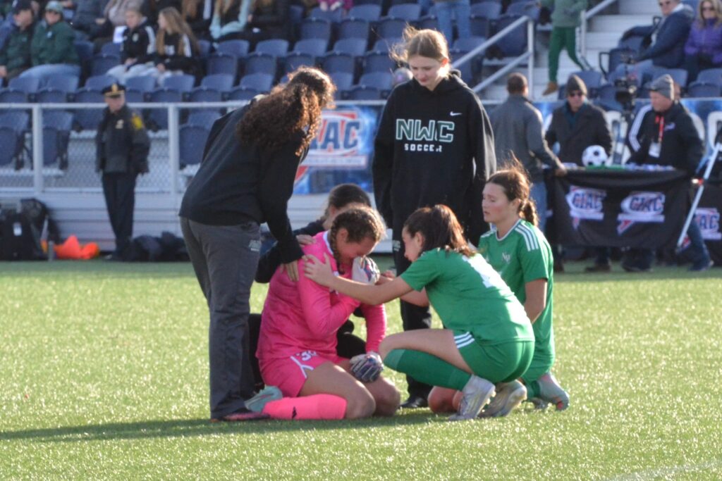 Six minutes later Northwest nearly took the lead off its first corner kick of the game. The ball was nodded down off the turf and took a big bounce toward the inside of the back post, but Brookly Nittoly held her position on the post and nodded the ball out of danger.