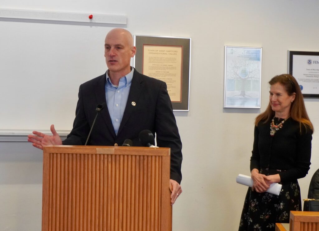 CTDOT Commissioner Garrett Eucalitto speaks at a press conference about West Hartford’s Community Connectivity Grant. At left is Lt. Gov. Susan Bysiewicz. Jan. 21, 2026. Photo credit: Ronni Newton