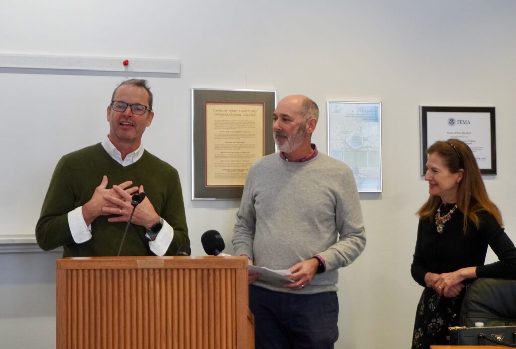 Jay Stange (left) and Ethan Frankel of Bike West Hartford speak at a press conference about West Hartford’s Community Connectivity Grant. At right is Lt. Gov. Susan Bysiewicz. Jan. 21, 2026. Photo credit: Ronni Newton