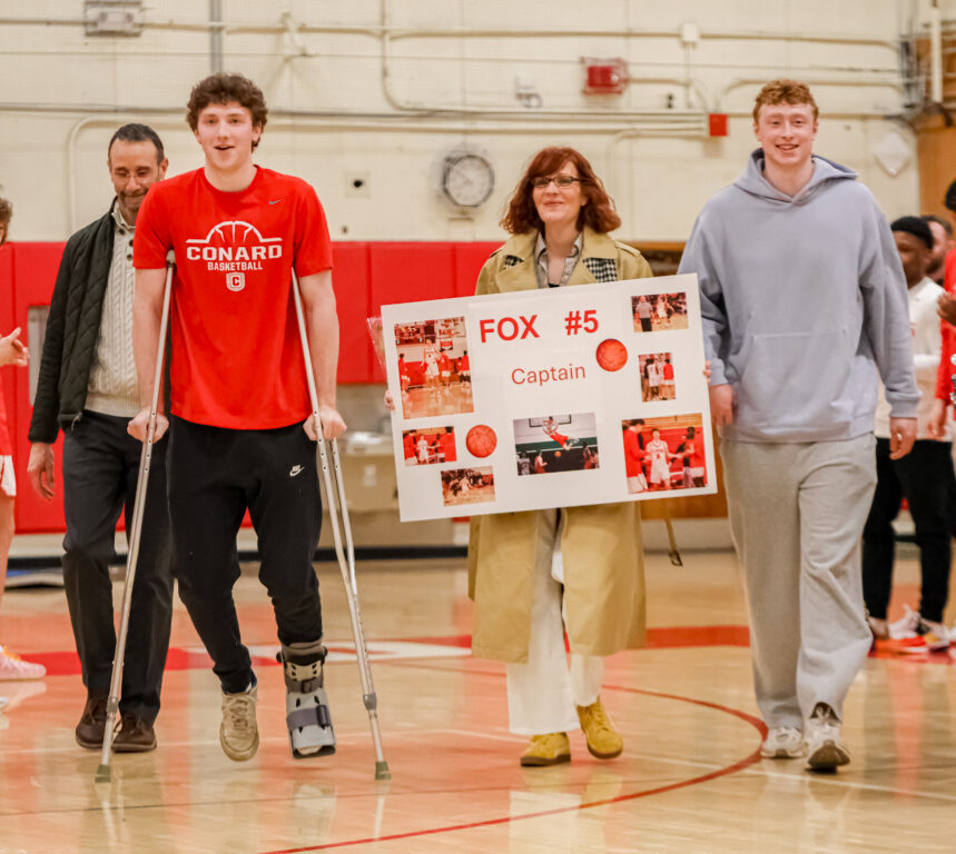 Senior Aidan Fox, who is recovering from an injury, is joined on the court by his family. Conard vs. Bristol Central boys basketball. Senior Night, Feb. 17, 2026. Photo credit: Cole Schweiger