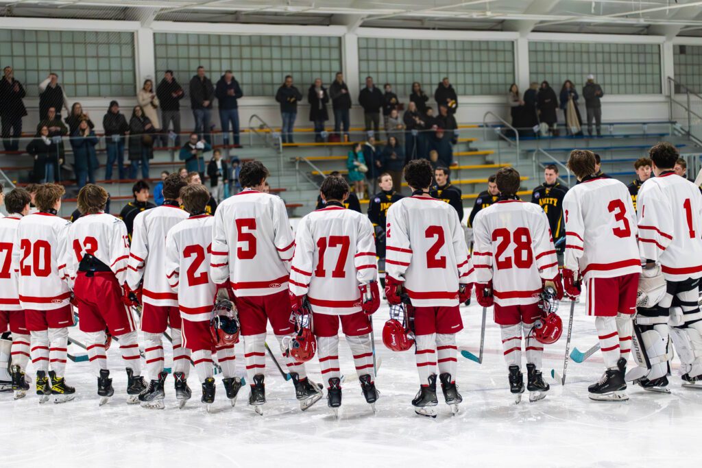 Conard and Amity players gather for a talk about the meaning behind the game. Conard vs. Amity boys hockey. Feb. 16, 2026. Photo credit: Savannah Cote