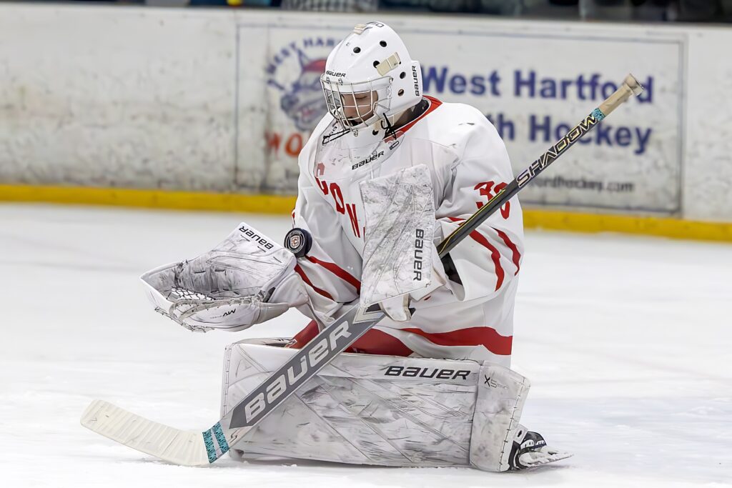 Chase Emery making one of his 47 saves. Conard vs. Amity boys hockey. Feb. 16, 2026. Photo credit: Scott Sulkazi
