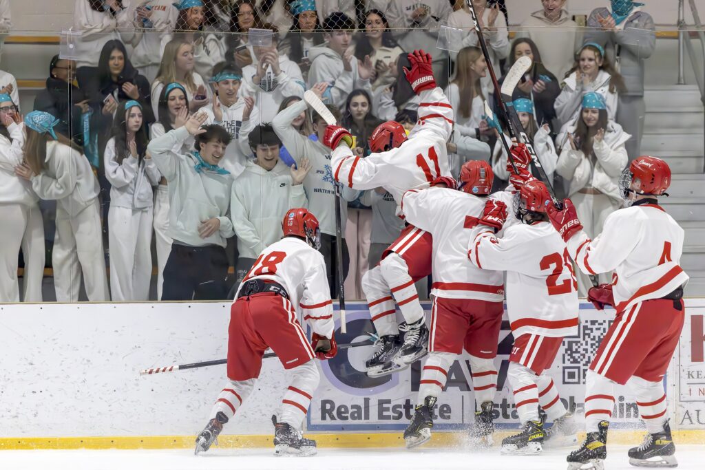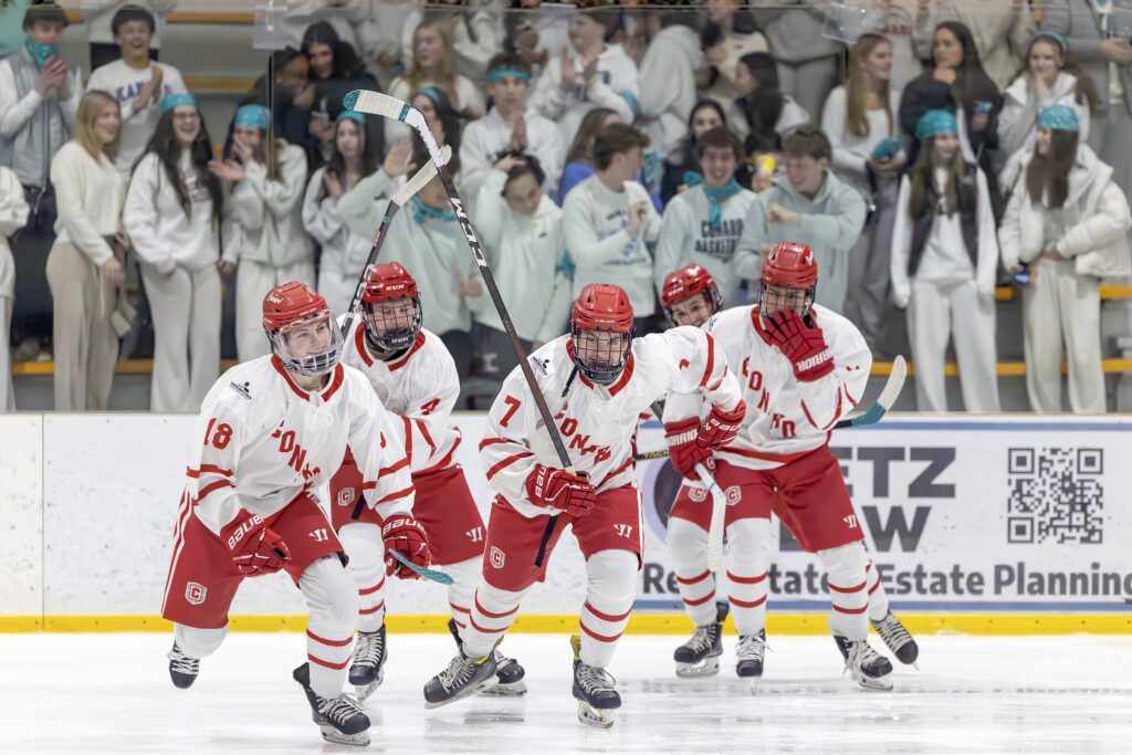 Conard players celebrate. Conard vs. Amity boys hockey. Feb. 16, 2026. Photo credit: Scott Sulkazi