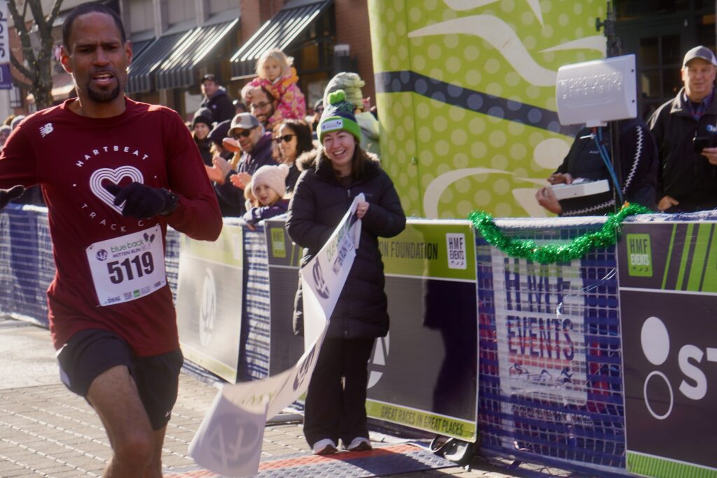 A cross country and track coach from West Hartford’s Conard High School was the first to break the tape at the finish line, on Isham Road in Blue Back Square. Mario Vazquez, 47, who lives in Farmington and was the winner of another HMF this fall – the Hartford Half Marathon – crossed the finish line Sunday in 15:23.