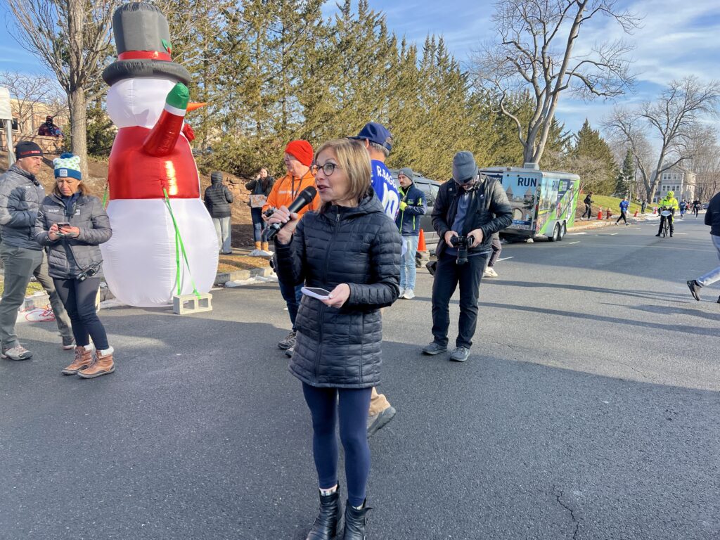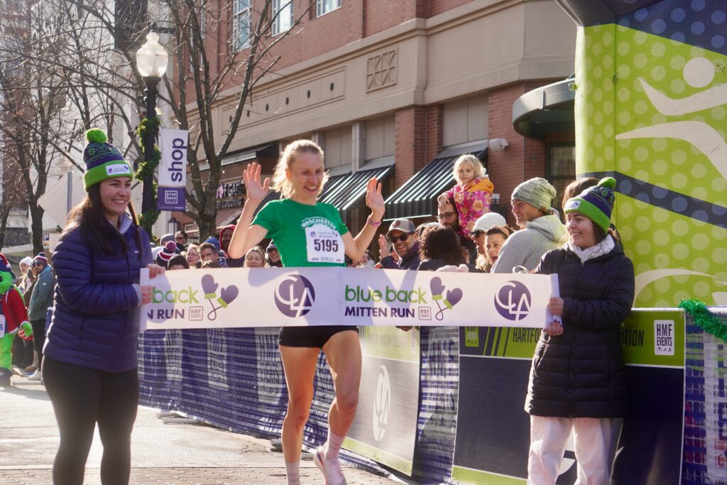 Elyse Adams, first female finisher. Hartford Marathon Foundation Blue Back Mitten Run. Dec. 7, 2025. Photo credit: Ronni Newton
