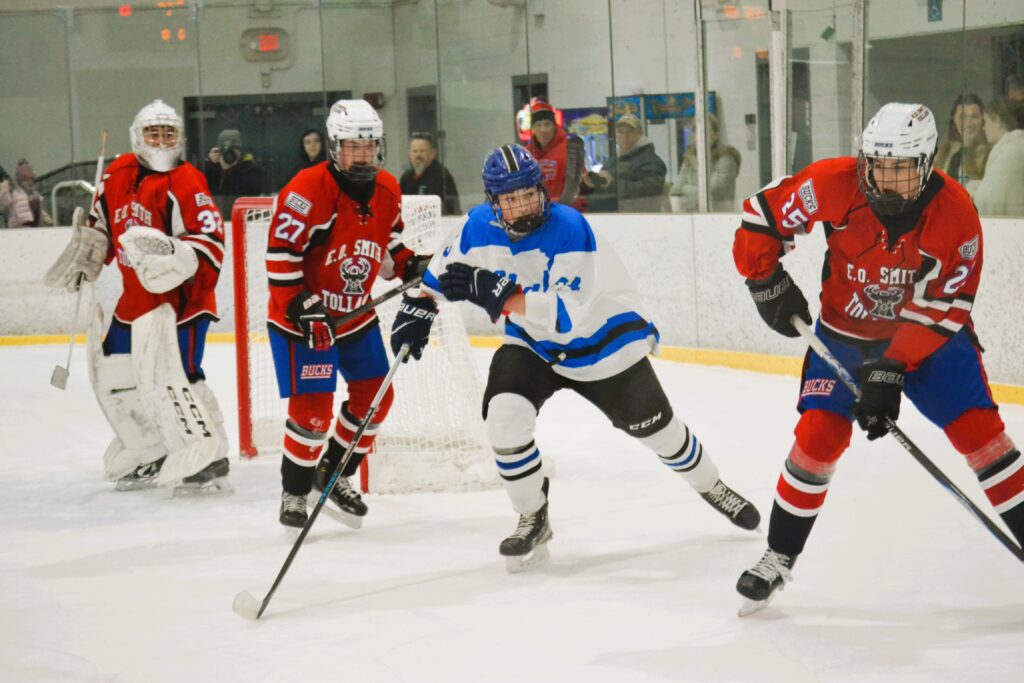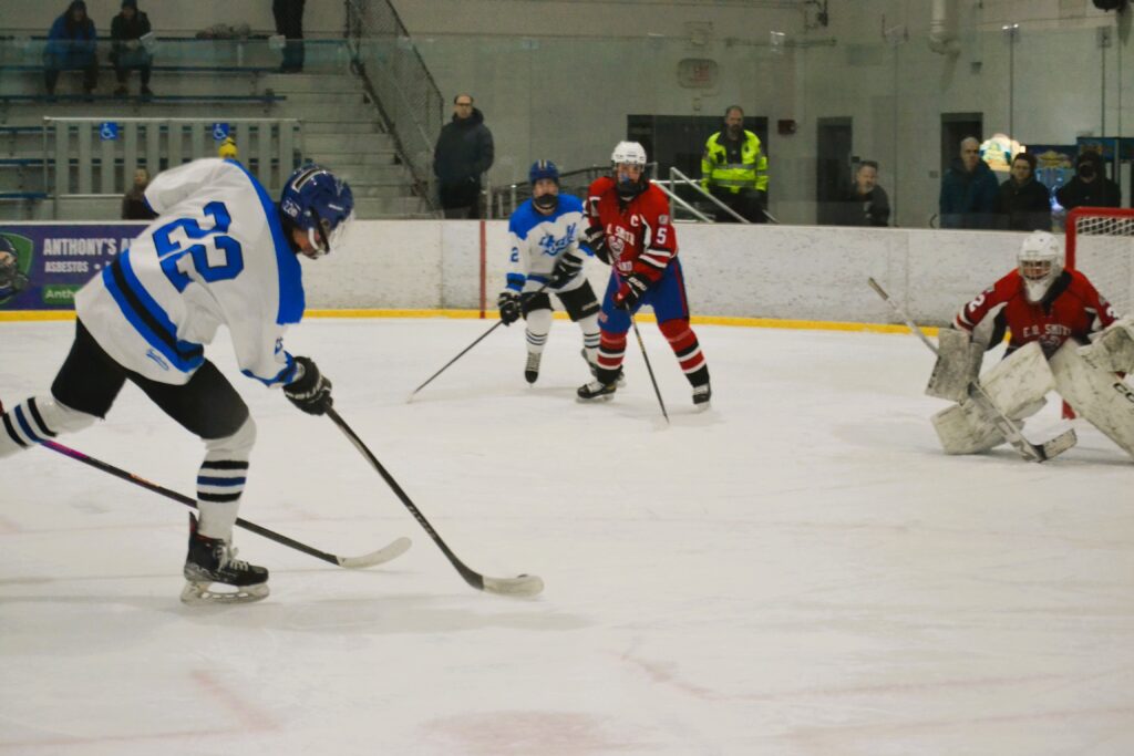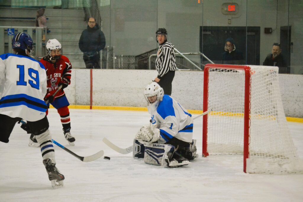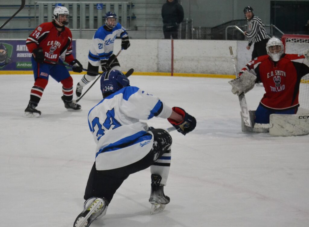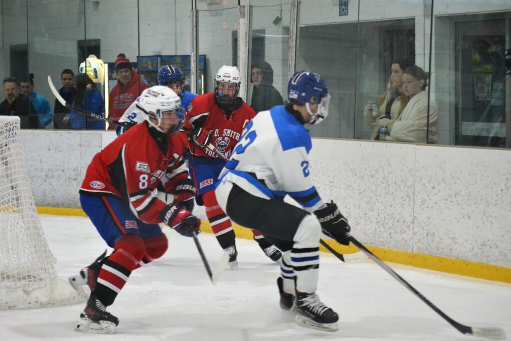With 7:25 to go, Smith/Tolland’s Sutton made a nice one-handed play to get past Hall’s Zach Orsey just past center ice. The move sent him in alone on Bonner, but Orsey pivoted and raced back on defense to cut off Sutton as he closed in on goal, and pus the player and puck into the corner.