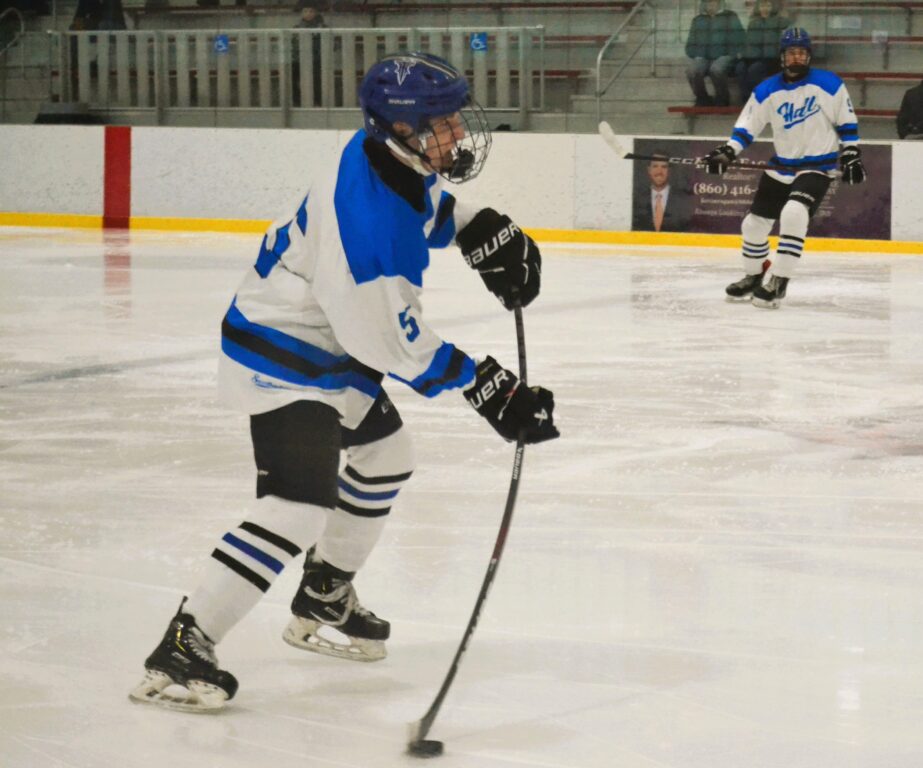 Ben Goldstein gets off the shot on goal for Hall. Hall vs. EO Smith/Tolland boys hockey. Jan. 24, 2026. Photo credit: Paul Palmer