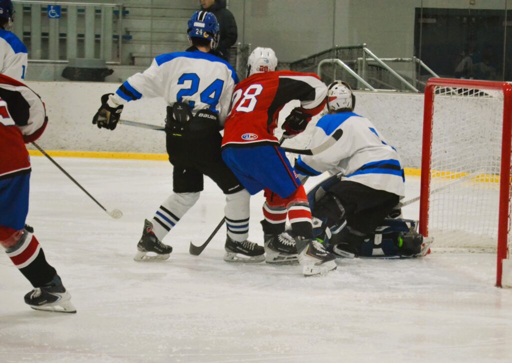 With time running down, the Titans kept up the pressure at both ends. On offense Jordan Scher had a good chance that was deflected by a defender, Goldstein’s shot from the half boards was blockered away by Peralta, and McHugh won a face-off and carried the puck straight at the goal but saw his shot deflected high.