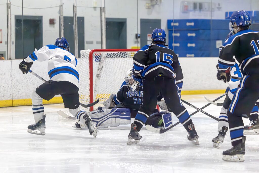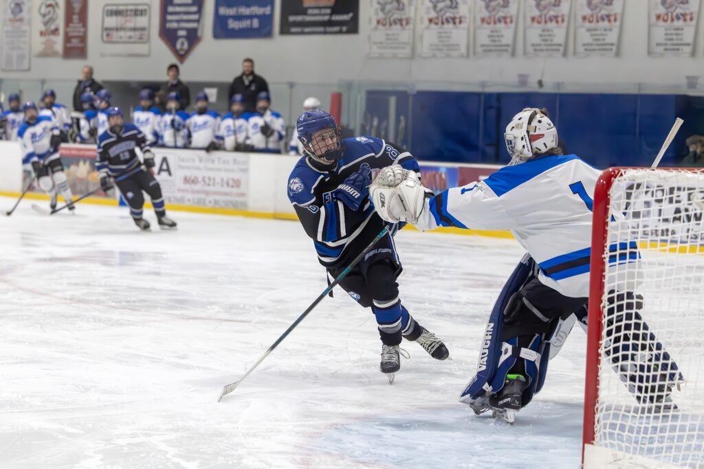 Benjamin Putnam shoots on goal. Hall Titans vs. Terriers boys hockey. Feb. 9, 2026. Photo credit: Scott Sulkazi