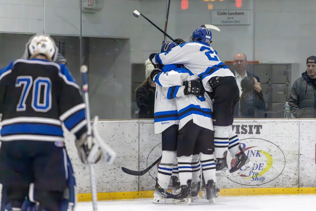 The Titans celebrate one of their goals. Hall Titans vs. Terriers boys hockey. Feb. 9, 2026. Photo credit: Scott Sulkazi
