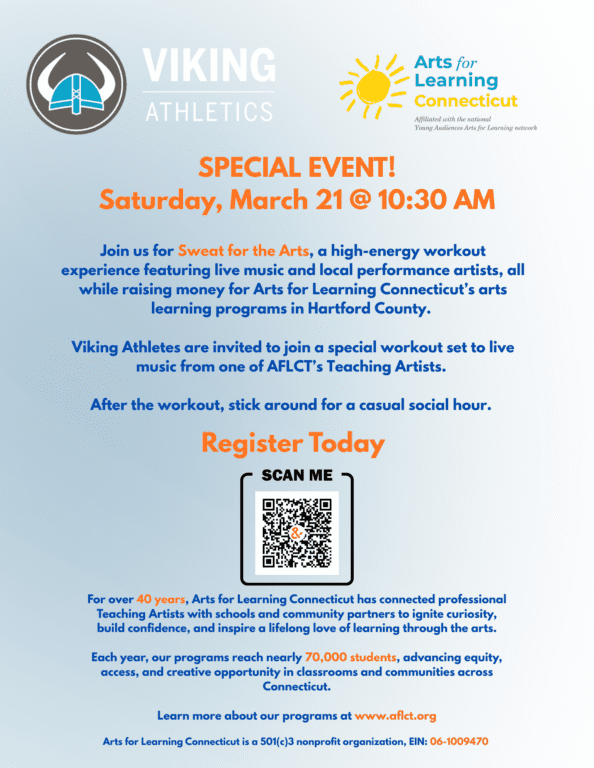 “Sweat for the Arts is about bringing people together around two things that energize communities – movement and creativity,” said Jed Kornbluh, Director of Business Development at Arts for Learning Connecticut. “Every participant helps support programs that bring professional artists into schools and community spaces across Connecticut. We are thrilled to partner with Erik Castiglione, owner of Viking Athletics, and his coaching staff. He has proven to be a tremendous community resource in West Hartford, and we’re lucky to count Erik among our supporters.”