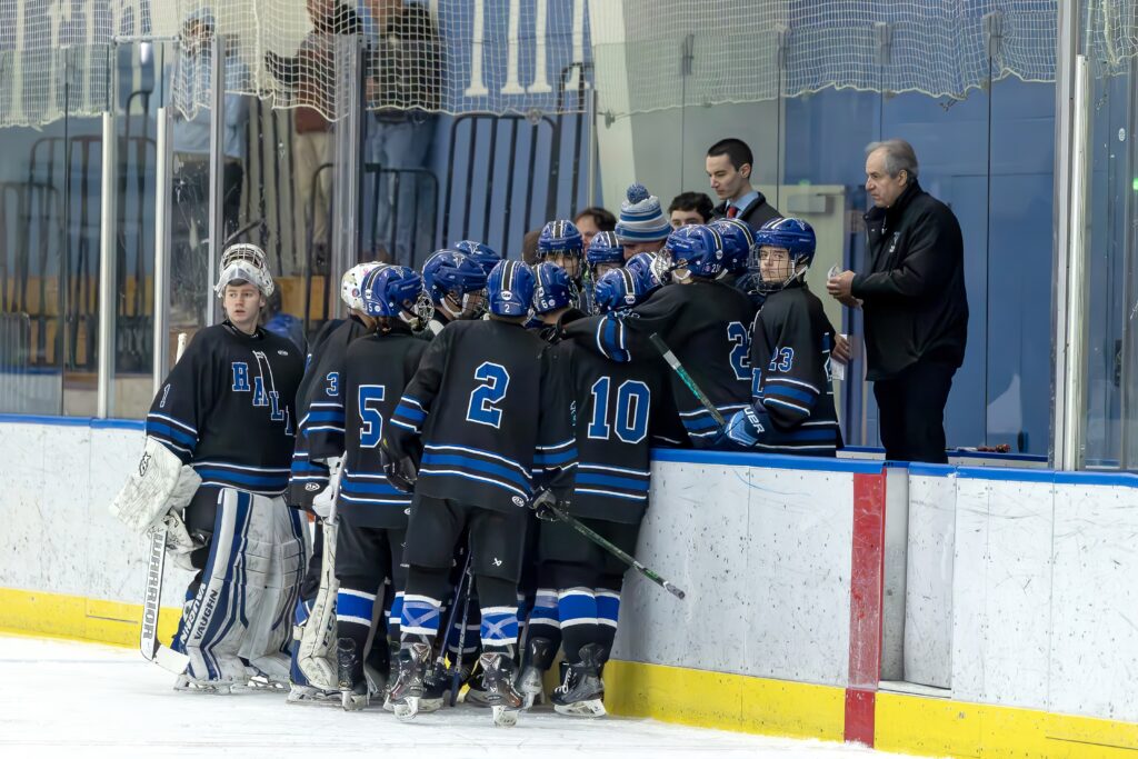 Hall Titans strategizing. Hall vs. Rocky Hill. CIAC Division III boys hockey quarterfinal. March 12, 2026. Photo credit: Scott Sulkazi
