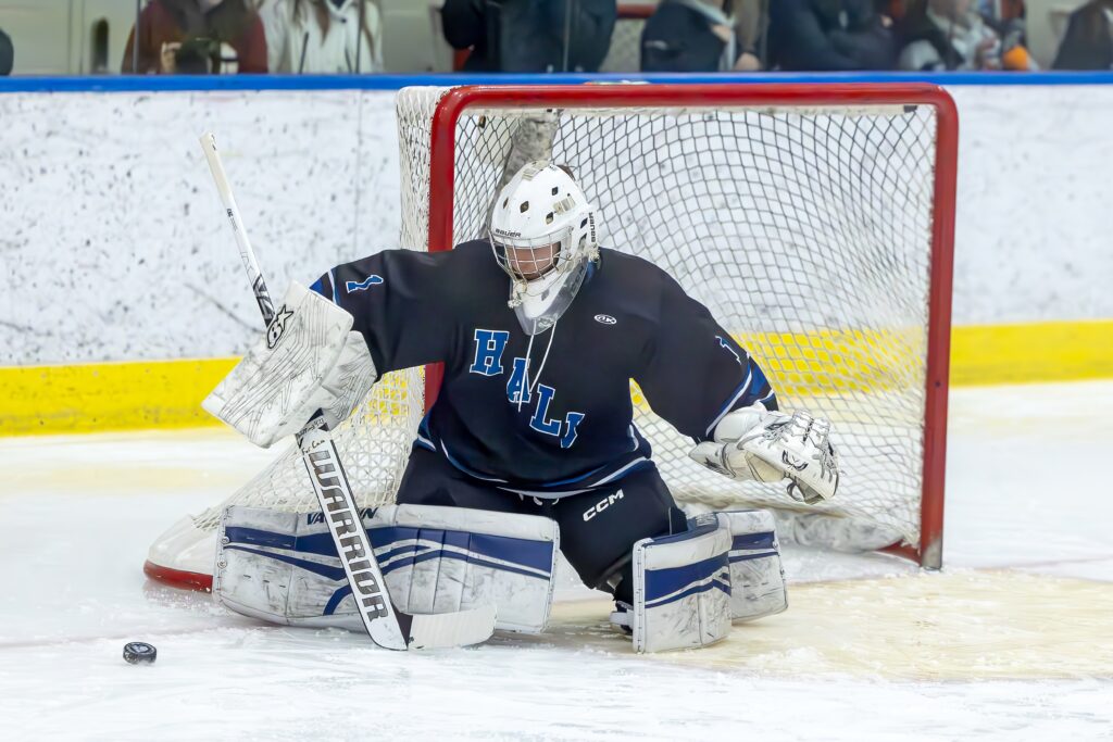 Matthew Bonner making a save. Hall vs. Rocky Hill. CIAC Division III boys hockey quarterfinal. March 12, 2026. Photo credit: Scott Sulkazi