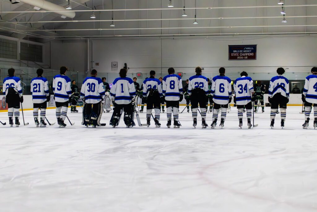 Hall’s starting lineup during the national anthem. Hall vs. Northeast boys hockey. Dec. 17, 2025. Photo credit: Savannah Cote
