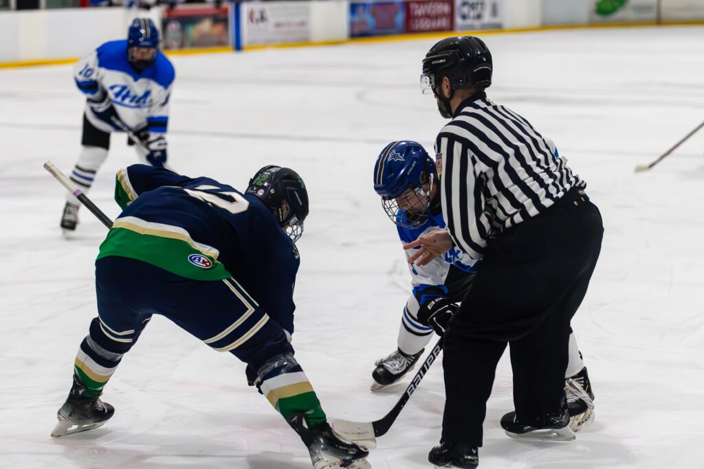 Hall and Shamrocks during a faceoff. Hall vs. Northeast boys hockey. Dec. 17, 2025. Photo credit: Savannah Cote