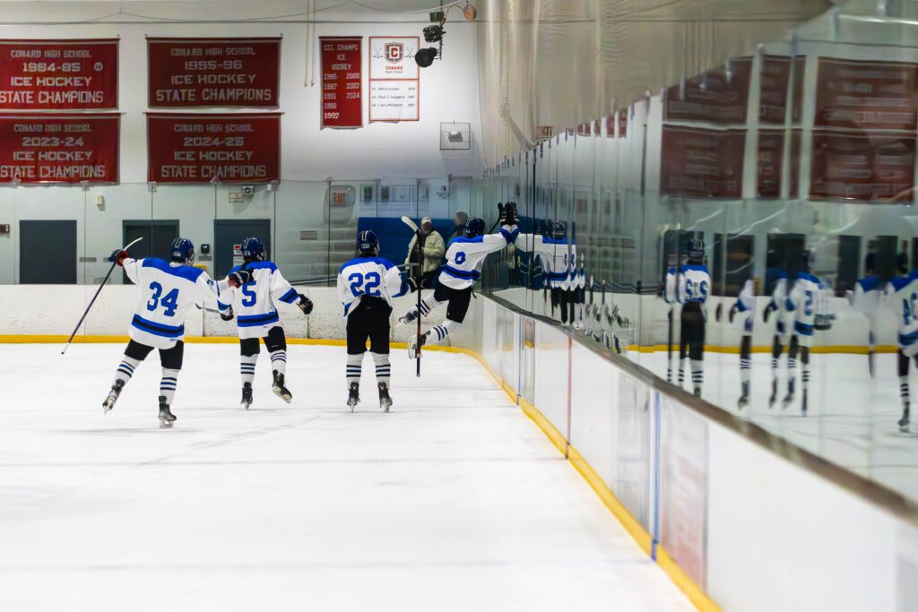 Benjamin Putnam celebrating after scoring the game winning goal. Hall vs. Northeast boys hockey. Dec. 17, 2025. Photo credit: Savannah Cote