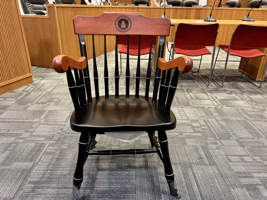 Commemorative chairs from the Town of West Hartford are given to outgoing Board of Education and Town Council members in recognition for their service. Photo credit: Ronni Newton